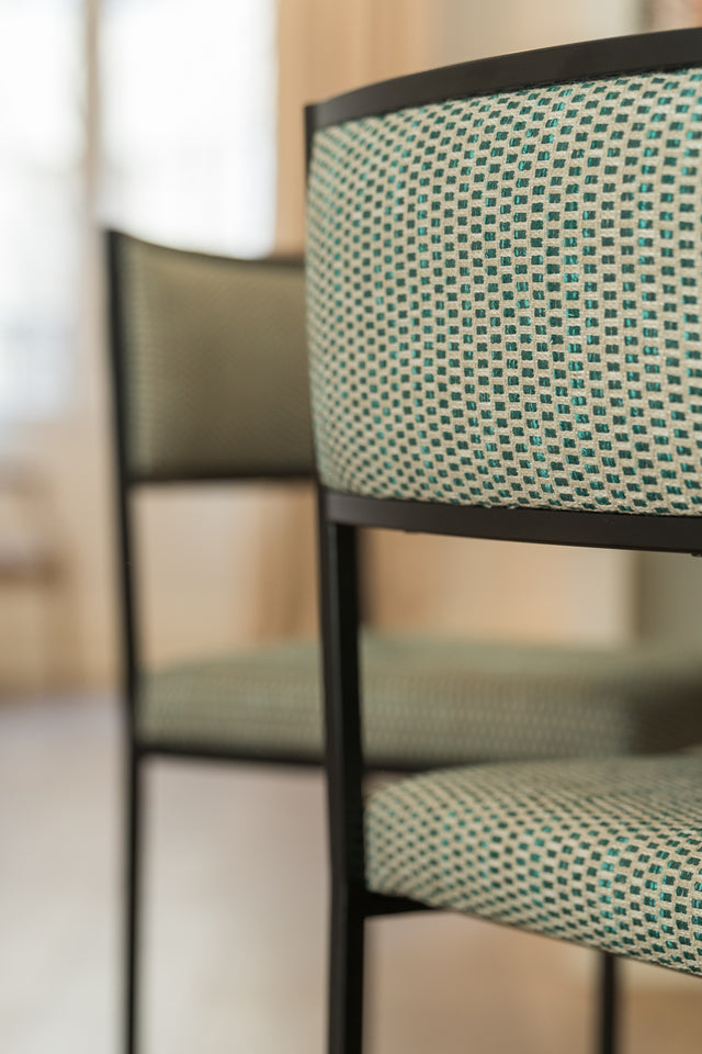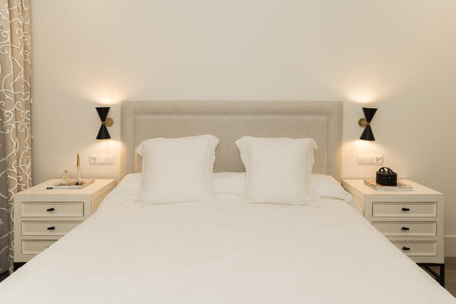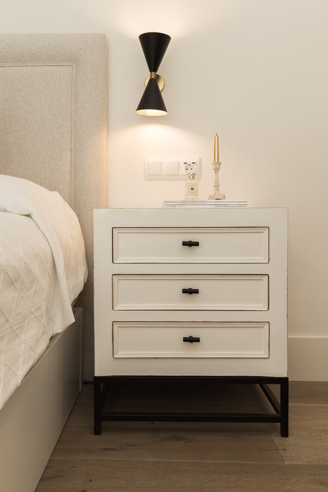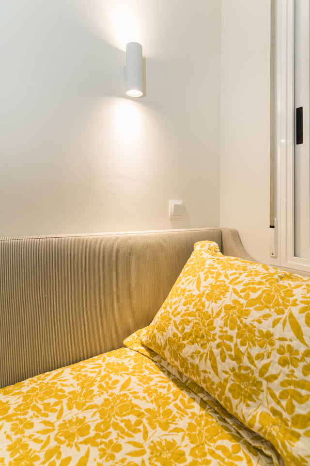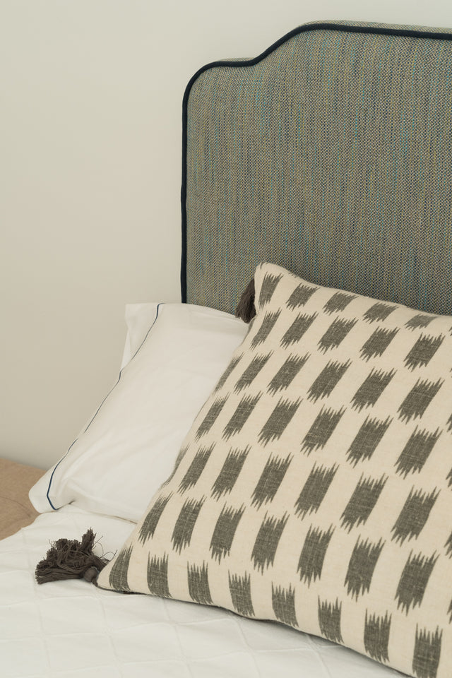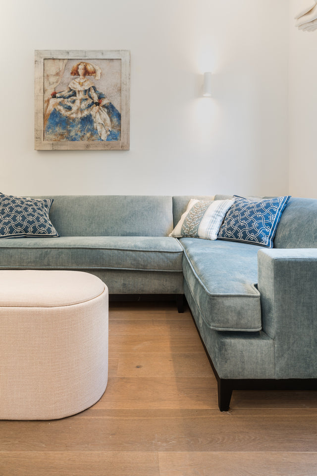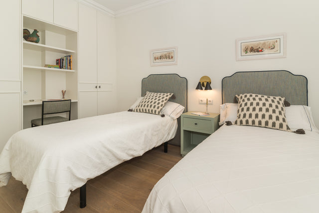 Tanto los sofás como los cabeceros tapizados, realizados por nuestros artesanos, se diseñaron con mucho mimo para cada espacio. Sofás en blanco roto en el salón para aportar la luminosidad, un tono verde agua en el despacho para incorporar algo de frescura en un ambiente de trabajo, y un cabecero más atemporal en tono greige que incita a la tranquilidad en el dormitorio principal.