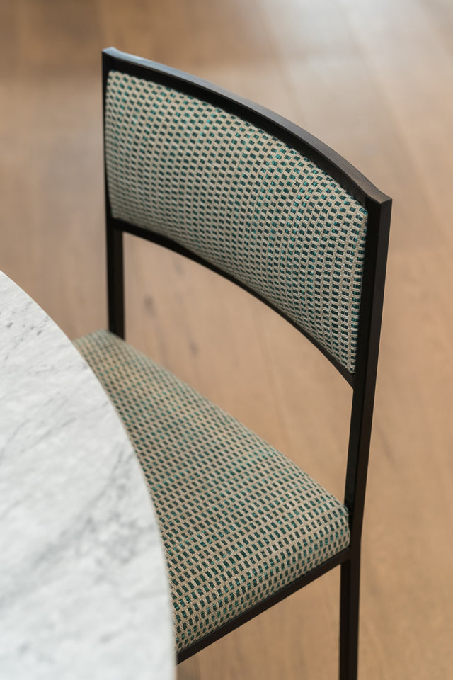 Nos decantamos por algo más divertido en los cabeceros curvilíneos del dormitorio de los niños y en las sillas del comedor, ambos en tonos verdes que aportan diseño y desprenden frescura. El mobiliario, también a medida, se diseñó para potenciar la calidez del espacio. Para lograrlo, se utilizaron materiales que reflejan cada rayo de luz, como acabados lacados en tonos claros, vidrios y la espectacular mesa Milán con el sobre en mármol.