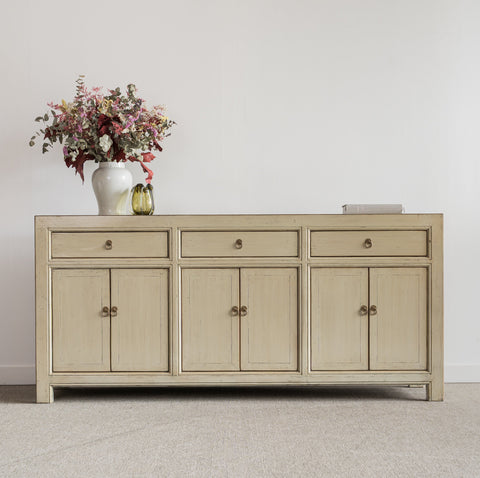 Aparador de gran capacidad, realizado en madera de pino y pintado a mano y con un acabado brillo. Este acabado en verde grisáceo hace del gran aparador Bremen una pieza atemporal llena de carácter. Dispone de tres cajones en la parte superior y seis puertas en la parte inferior. Estas cubriendo tres huecos divididos por un estante de madera para aumentar la capacidad de almacenaje. Tiradores de anilla realizados en cobre.