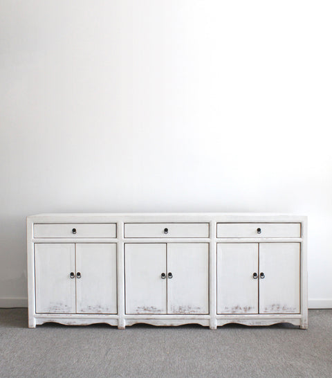Nuestro aparador Copenhague será perfecto para acompañar a tu comedor. Un mueble grande con mucha capacidad que consta de tres cajones y seis puertas y en su interior un estante divide el espacio para conseguir mayor capacidad de almacenaje. Realizado en madera de pino y pintado a mano en blanco mate con un sutil envejecido, y tiradores de anilla en cobre.
