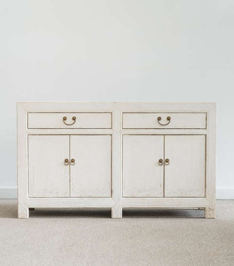 Nuestro aparador Cuba es el complemento perfecto para tu comedor. Con cajones en la parte superior y armario en la parte baja, dónde podrás almacenar todo lo que necesites gracias al estante que divide en dos alturas el interior. Los tiradores en forma de anilla al estilo oriental realizados en cobre, disponen de almohadillas plásticas en las patas para proteger el suelo de posibles arañazos. Además, al estar pintados a mano, conseguimos unos colores que dejarán fascinados a tus invitados. En esta ocasión pintado en blanco con un sutil envejecido y acabado mate.