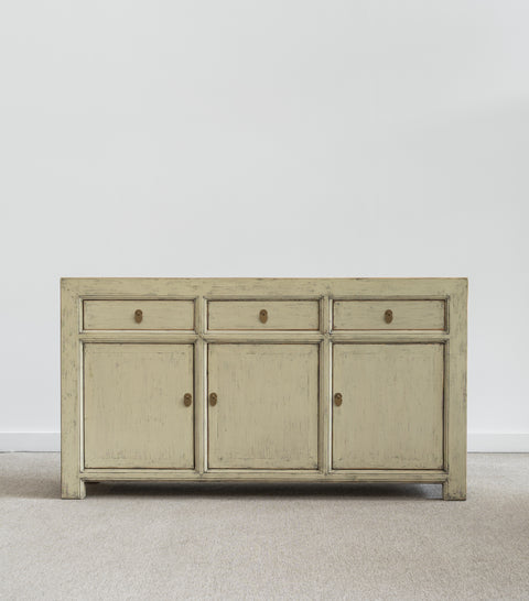 Aparador realizado en madera de pino y pintado a mano en verde grisáceo con un sutil envejecido y lacado en brillo. Dispone de tres cajones en la parte superior y tres puertas en la parte inferior. En su interior dispone de estantes de madera para aumentar la capacidad de almacenaje. Los tiradores en forma de lágrima al estilo oriental realizados en cobre.