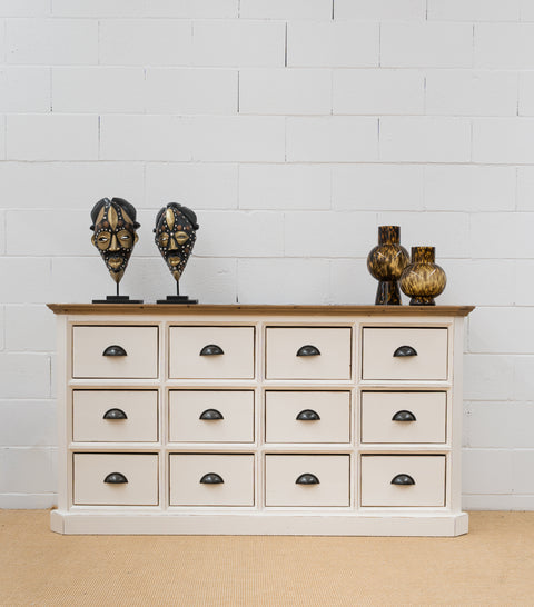 Nuestra cómoda Dallas está realizada en madera de abedul, pintada a mano en blanco con un sutil envejecido y la tapa en madera natural. Dispone de doce amplios cajones iguales, y sus tiradores están hechos de cobre en forma de concha.