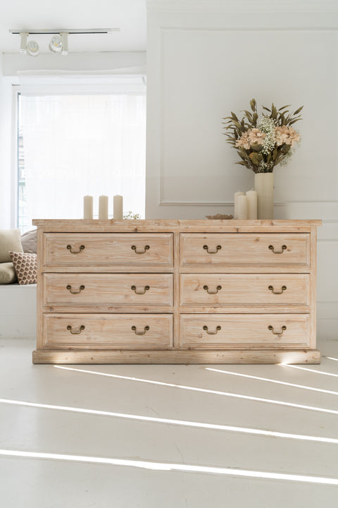 Nuestra cómoda Viena será la pieza perfecta para tu dormitorio. Con gran capacidad de almacenaje y un diseño clásico. Está realizada en madera de abedul y la podrás encontrar en acabado natural o patinada en blanco. Dispone de nueve cajones iguales, y sus tiradores están hechos de cobre.