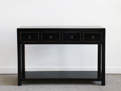 Consola en madera de abedul, con cuatro cajones y una balda inferior, con acabado en color negro sutilmente envejecido con un acabado satinado. Los tiradores en forma de anilla al estilo oriental realizados en cobre, y además disponen de almohadillas plásticas en las patas para proteger el suelo de posibles arañazos.