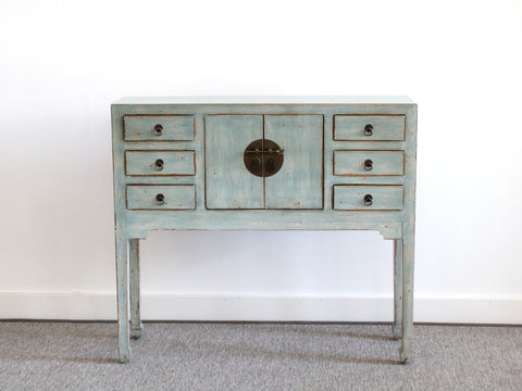 Nuestra consola Sendai quedará perfecta en cualquier espacio como mueble auxiliar. El estilo oriental, que le aporta en gran parte, el medallón de bronce, dota al mueble de gran personalidad. Realizada en madera de abedul y pintada a mano en tonos azules cielo sobre un fondo blanco y efecto envejecido.