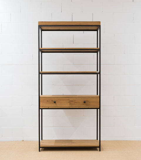 Aporta un toque industrial con nuestra estantería Atlanta. Realizada en hierro negro y estantes en madera de abedul incorporando en el centro dos amplios cajones.