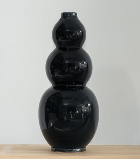 Jarrón de color azul marino oscuro brillante, con una forma suave y redondeada. Su diseño con curvas regulares le dan un aspecto armonioso y equilibrado. Tiene una base circular y estable, un cuerpo abombado que se estrecha suavemente hacia el cuello. El acabado es liso y brillante. Su forma simple y uniforme le da un aire moderno y elegante, ideal para decoración
