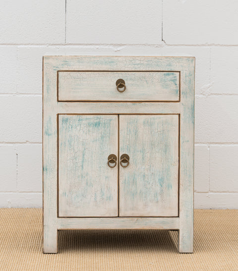 Nuestra mesilla Samai es un clásico. De estilo colonial, su diseño es tan práctica como atemporal. Realizada en madera de pino y pintada a mano en tonalidades de blancos y azul claro, con un efecto craquelado y un barniz brillo. En el interior, tras las puertas, una balda divide en dos el espacio. Los tiradores en cobre de anilla estilo orienta.