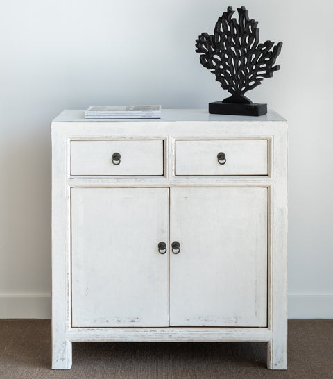 Mueble auxiliar, en madera de pino, lacado en color blanco con un sutil envejecido y un acabado mate. Dispone de dos cajones y dos puertas, y tras ellas una balda intermedia divide el espacio para mayor almacenaje. Uno de los muebles más versátiles que tenemos. Tiradores en forma de anilla en cobre.