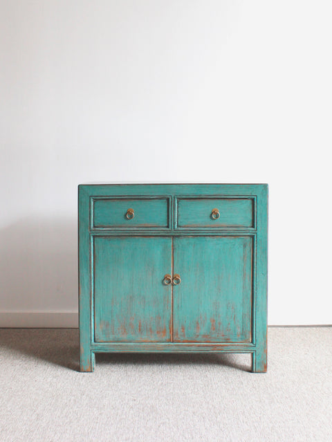 Mueble auxiliar, en madera de pino, lacado en color turquesa con un envejecido aportado gracias a una patina ennegrecida y con un acabado en brillo. Dispone de dos cajones y dos puertas, y tras ellas una balda intermedia divide el espacio para mayor almacenaje. Uno de los muebles más versátiles que tenemos. Tiradores en forma de anilla en cobre.