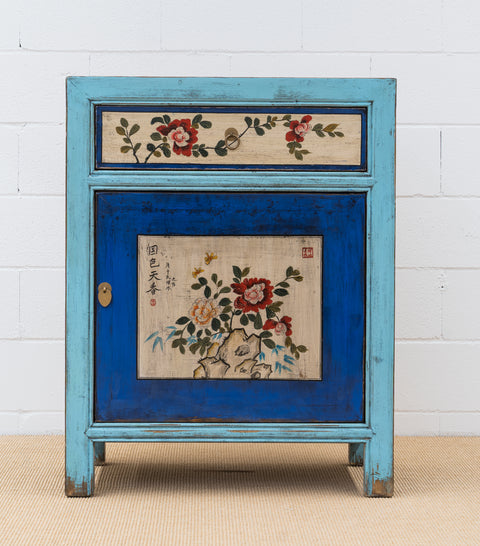 Mueble auxiliar realizado en madera pino, con un cajón y una puerta. Pintado a mano con motivos chinos, y terminado en alto brillo. Interior con una balda.
