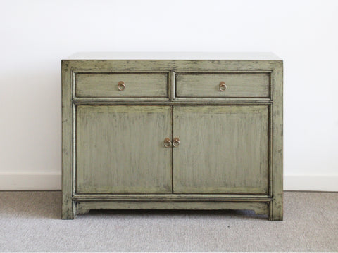 Pequeño aparador realizado en madera de pino lacado a mano en con una terminación que te enamorará. El mueble dispone de 2 cajones y 2 puertas. En su interior tiene una balda, esta se puede quitar o dejar para proporcionar el almacenaje perfecto. En esta ocasión nos lo encontramos en color vede oscuro con una pátina en negro que le aporta un aspecto envejecido. Acabado en brillo y con tiradores de cobre en forma de anilla.