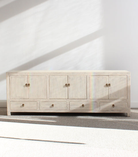 Un clásico! Mueble de televisión realizado en madera de pino y pintado a mano en un color blanquecino con tonos beige y acabado mate y una sutil patina en negro aportando un acabado envejecido. Con gran capacidad de almacenaje tras las puertas abatibles y la parte inferior del mueble dispone de cuatro cajones. Tiradores de anilla en cobre