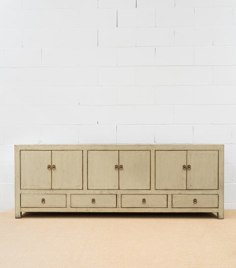 Un clásico! Mueble de televisión realizado en madera de pino y pintado a mano en un color verde grisáceo con toques de una pátina ennegrecida, acabado brillo y un sutil envejecido. Con gran capacidad de almacenaje tras las puertas abatibles y la parte inferior del mueble dispone de cuatro cajones. Tiradores de anilla en cobre