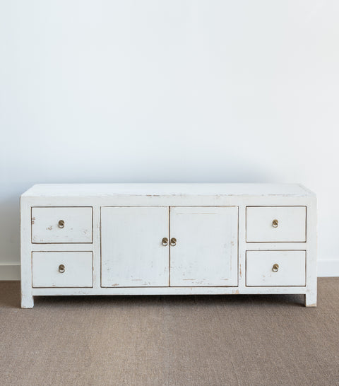 Mueble de televisión realizado en madera de abedul. Dispone de cuatro amplios cajones y en el centro un compartimento cerrado cuyo interior se encuentra dividido por una balda central para aumentar la capacidad de almacenaje. Pintado a mano en blanco con un aspecto envejecido y tiradores de anilla en cobre.