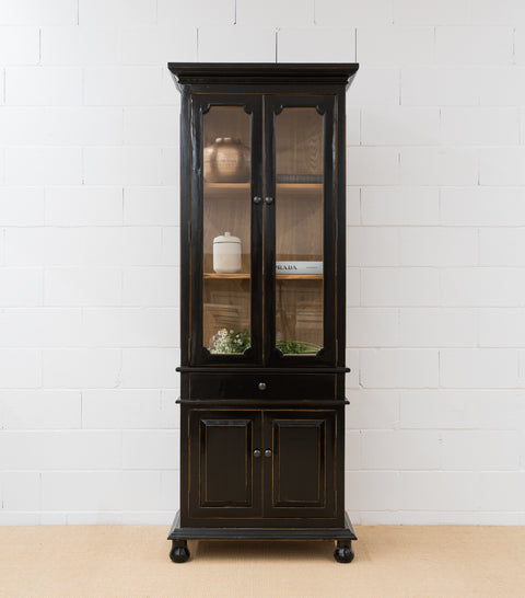 La vitrina Corinto es perfecta para atraer la atención de tus invitados, con su acabado en negro brillo y sus detalles clásicos. Realizada en madera de abedul y pintada a mano en negro con madera natural en el interior. Se compone de dos piezas, la superior consta de dos puertas de cristal con molduras de estilo neoclásico, y el interior se divide con tres baldas. La parte inferior se cierra con dos puertas opacas y una balda en el interior para dividir el espacio.